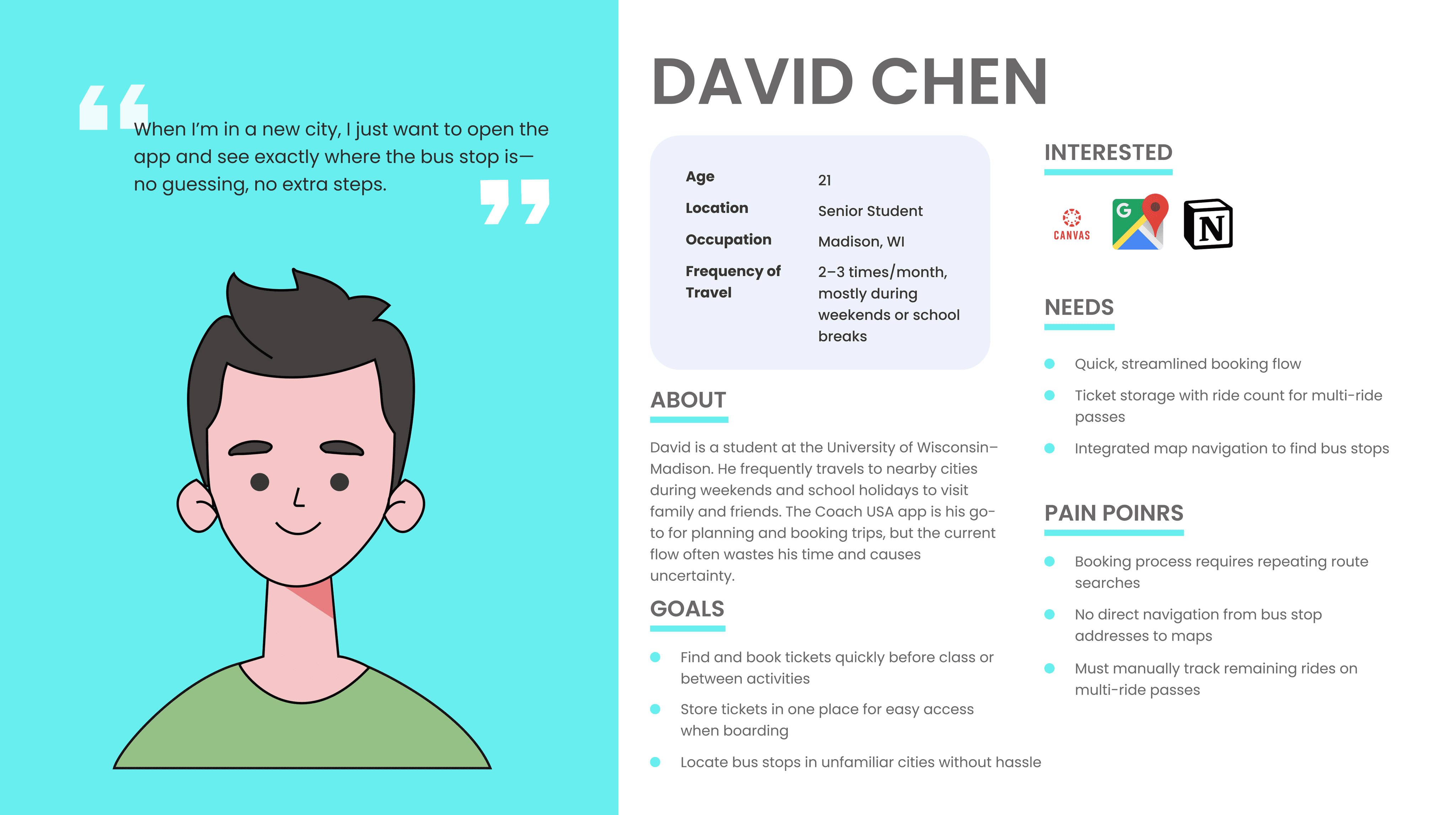 I recruited 10+ active Coach USA riders for user interviews and assigned 4 defined tasks using a paper prototype. Collected feedback with participant consent.