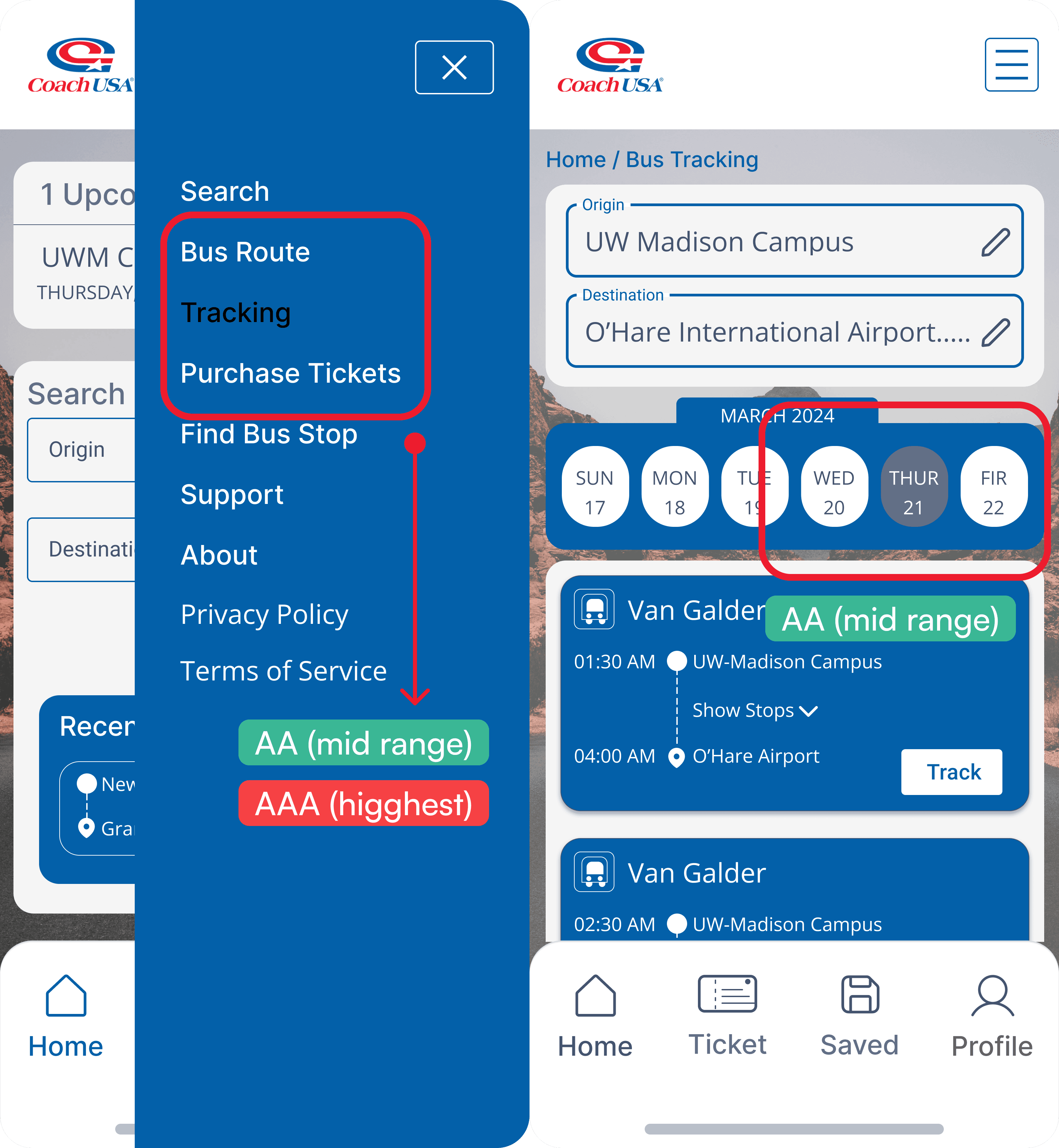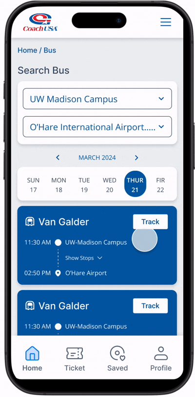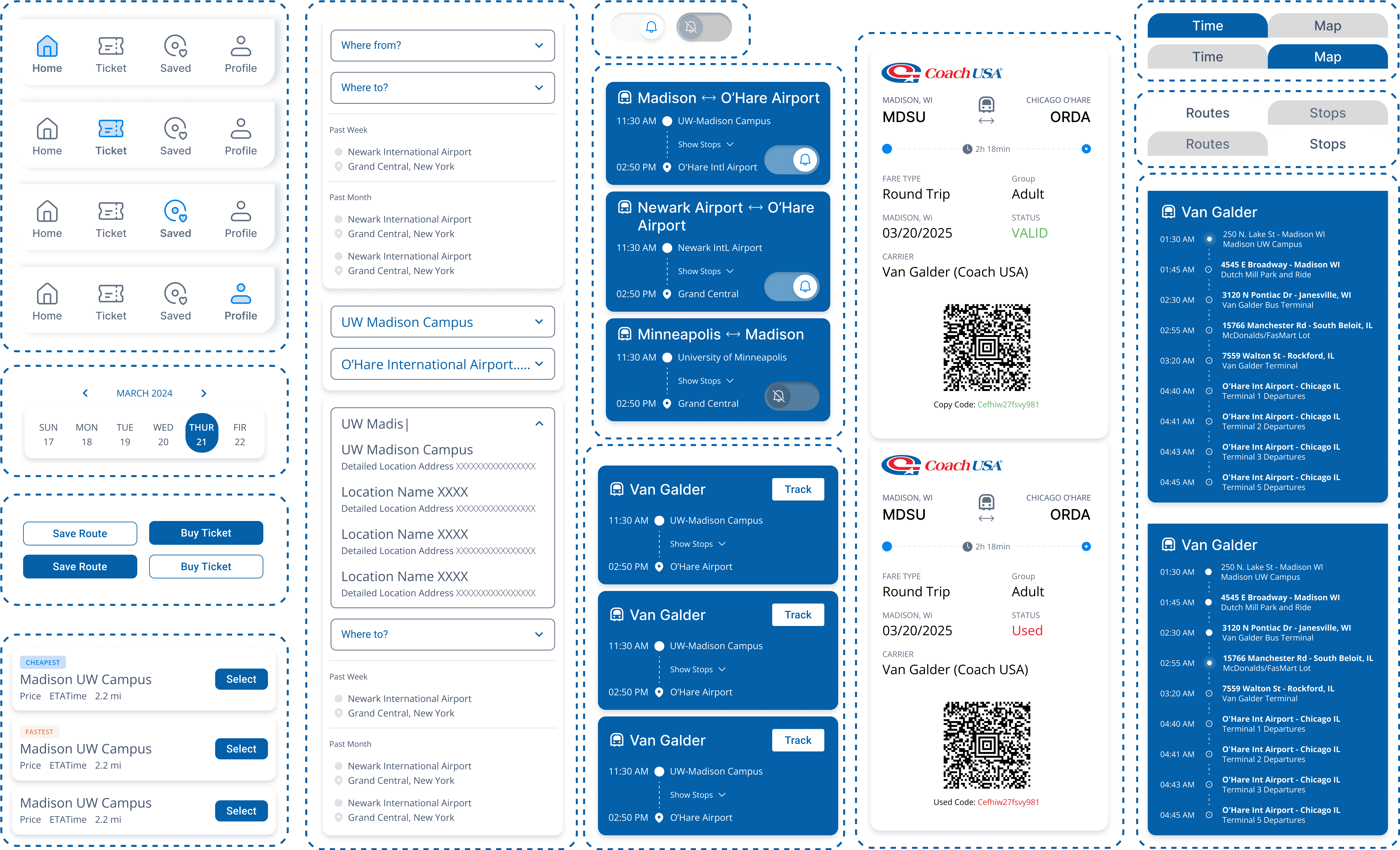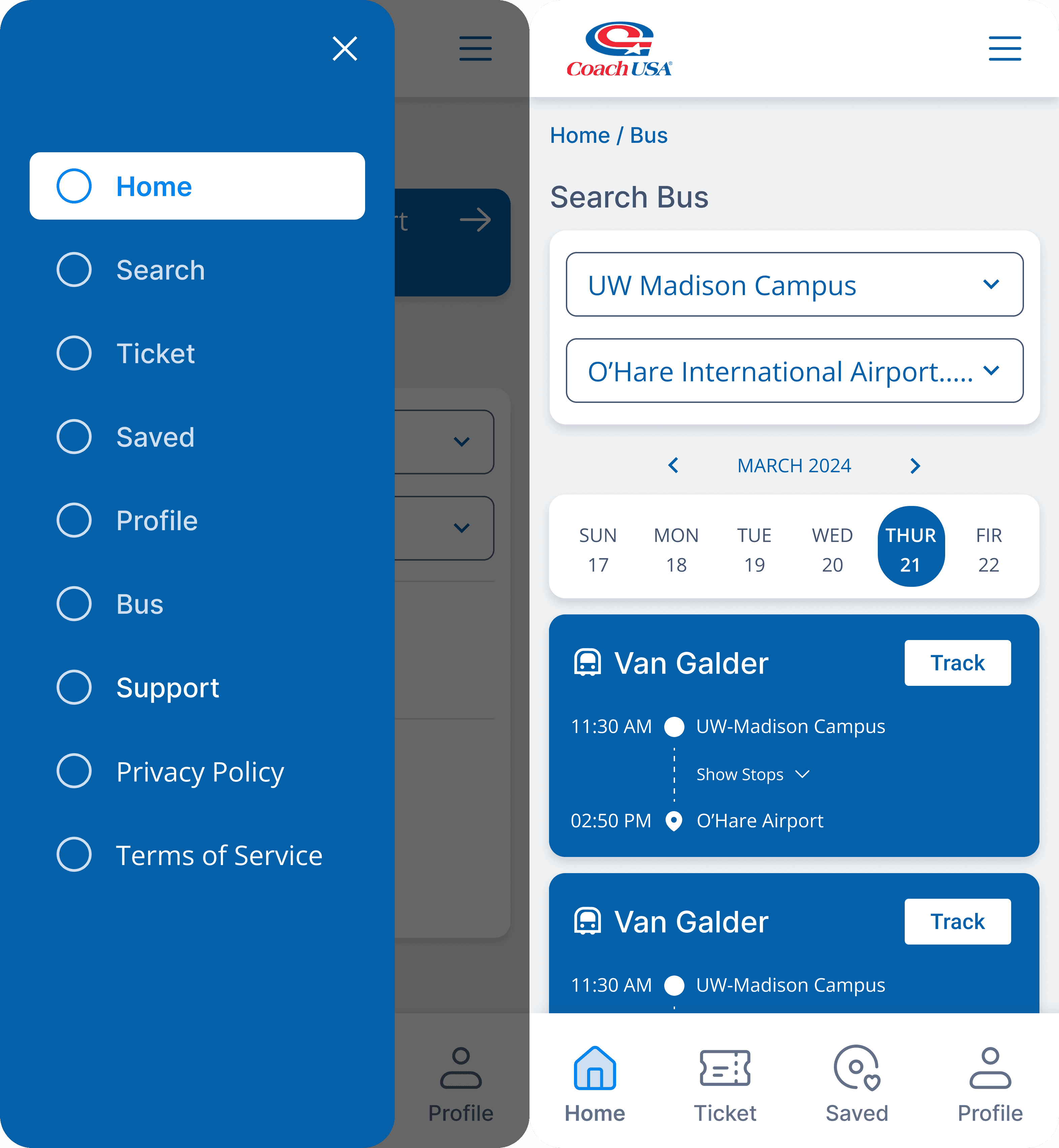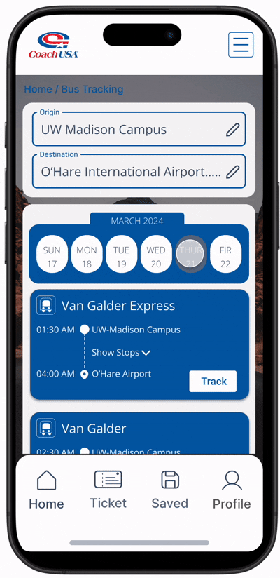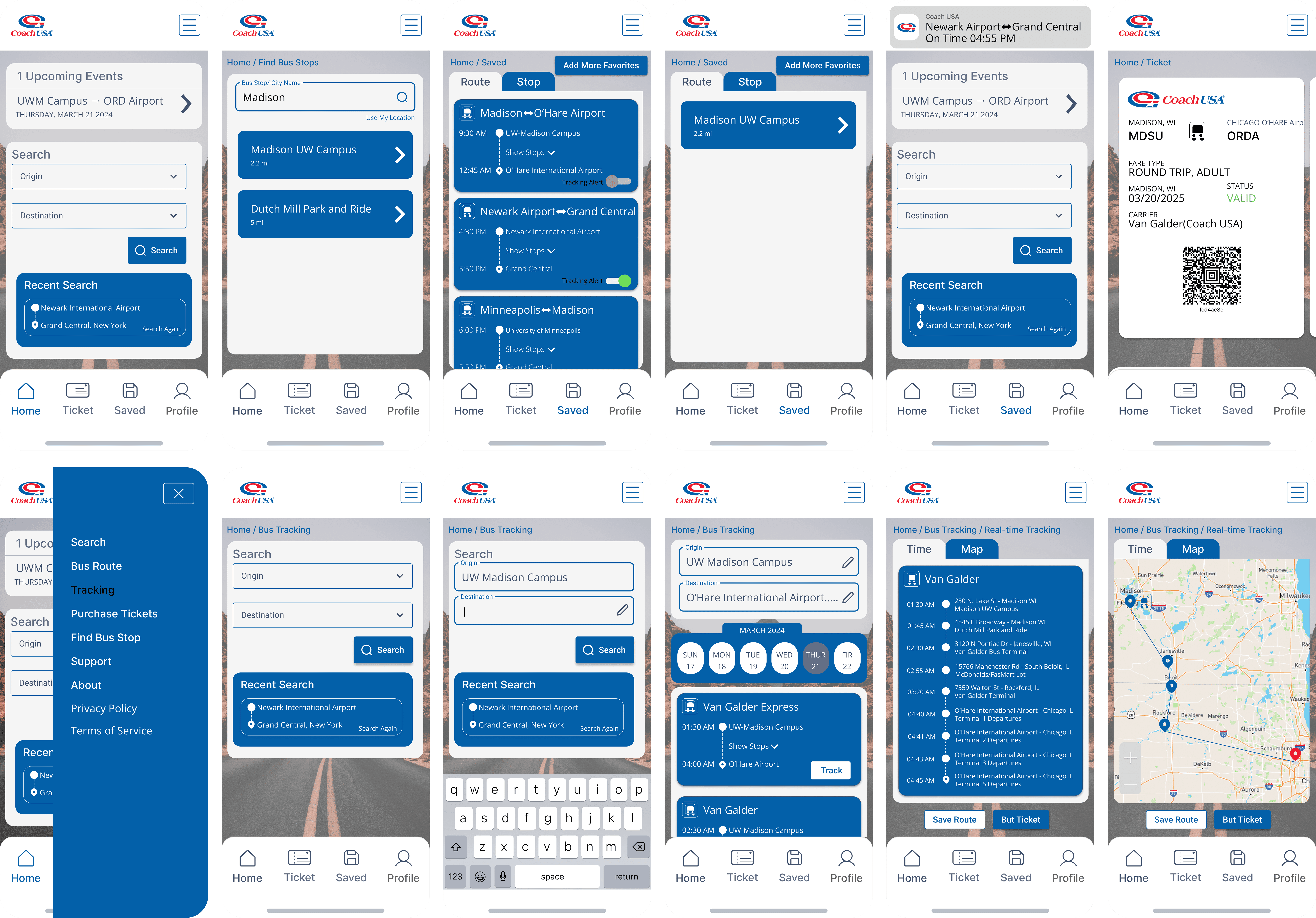 Refining the Coach USA app through multiple design cycles showed me that even small adjustments can significantly improve usability. User testing sessions uncovered friction points such as unclear button labels and non-sticky date selectors, which guided each round of iteration. I learned that continuous testing and feedback loops are essential for aligning the product with passenger expectations and habits