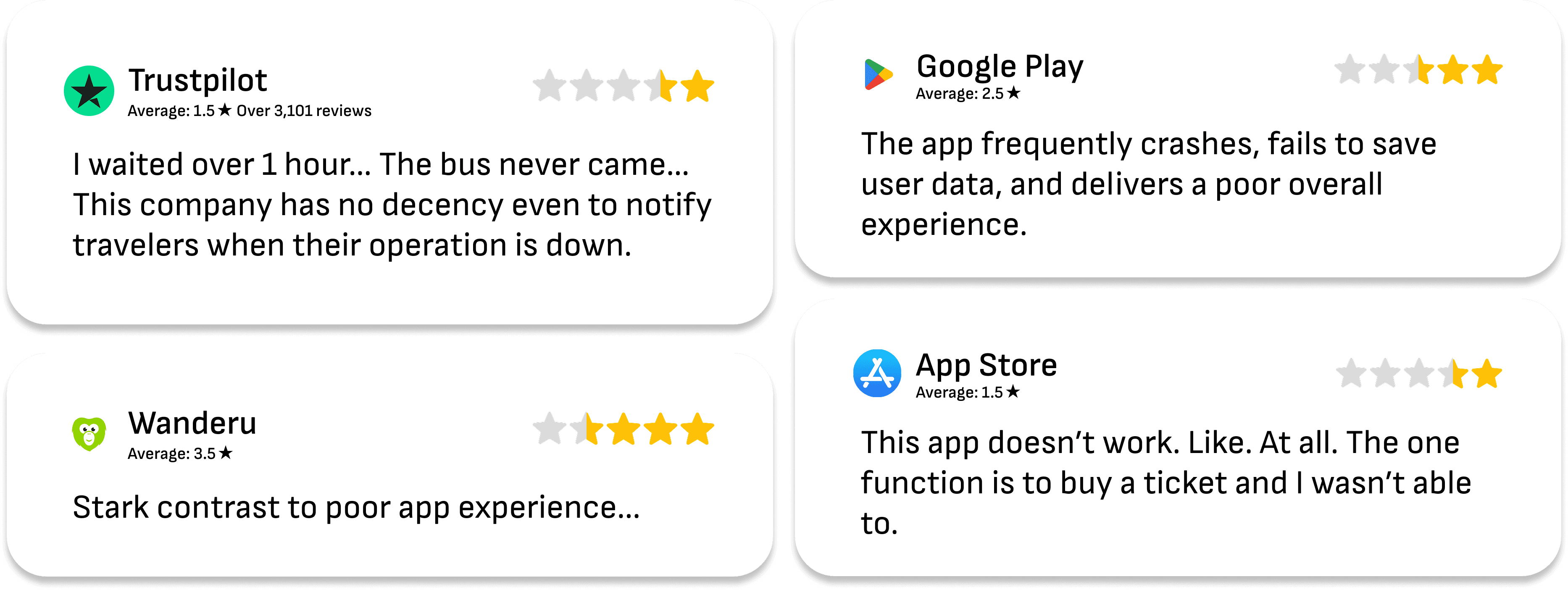 These pain points erode rider trust, increase pressure on customer service teams, and risk losing passengers to competitors like Greyhound and Megabus.